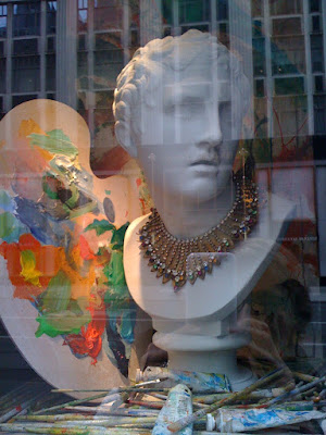 The Artwork of Hunt Slonem was on display along with a witty collection of "scwewy" fashions for which I have a wild hair for, just look at that dazzling necklace above along with the cleverly arranged palette, brushes and tubes of paint.